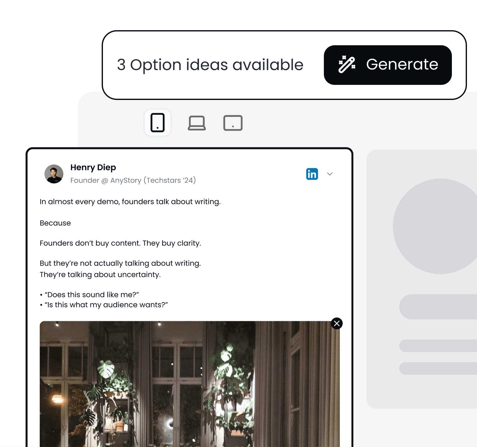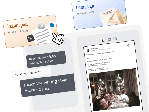 At AnyStory, we help founders create content that converts. We use AI to learn your voice, your work, and what you want to be known for, then turn it into posts, threads, and blogs built for each platform. So you can ship content like you have a strategist, writer, and designer on your team, without hiring one.