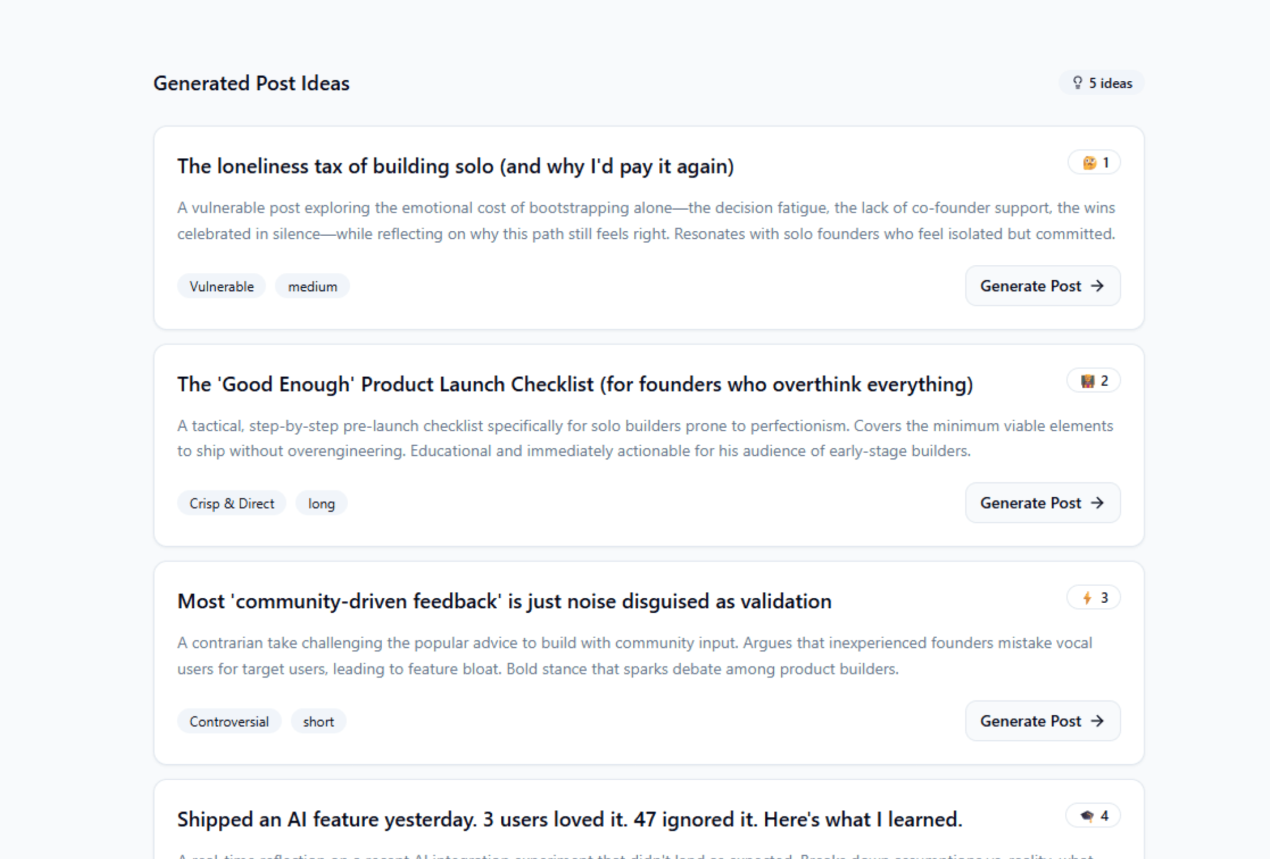 AI tool to generate content ideas that match your profile, experience, and personal brand. No more blank pages