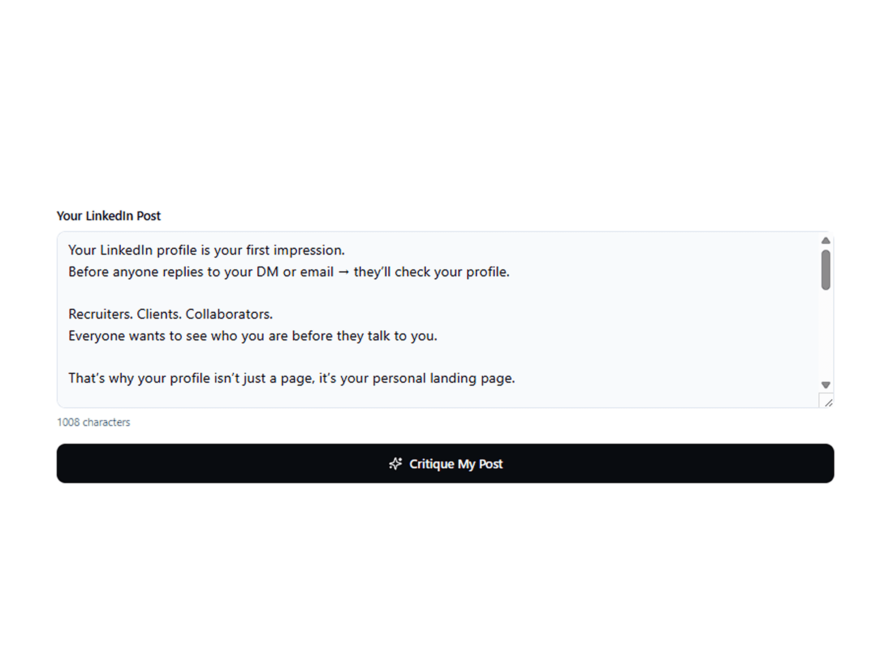 Paste your post and let AI review it like a coach. Get smart, actionable tips to make your writing more engaging and authentic.