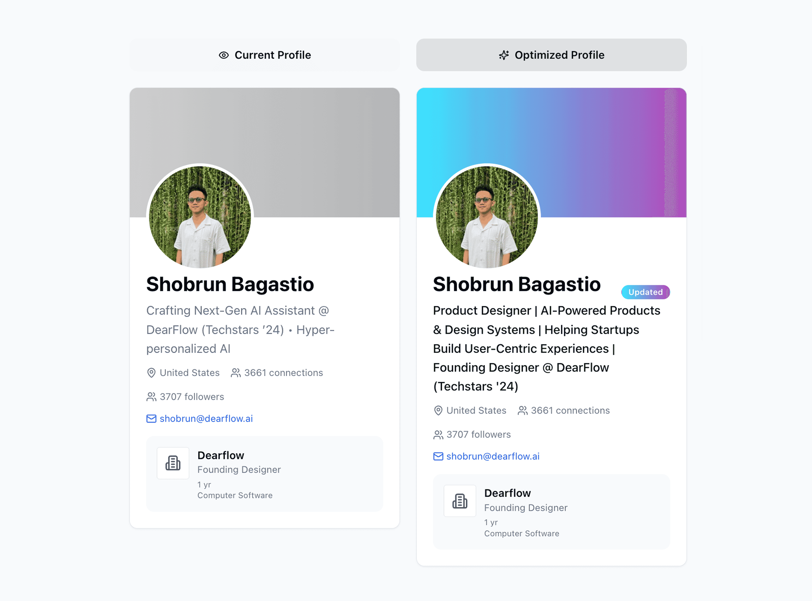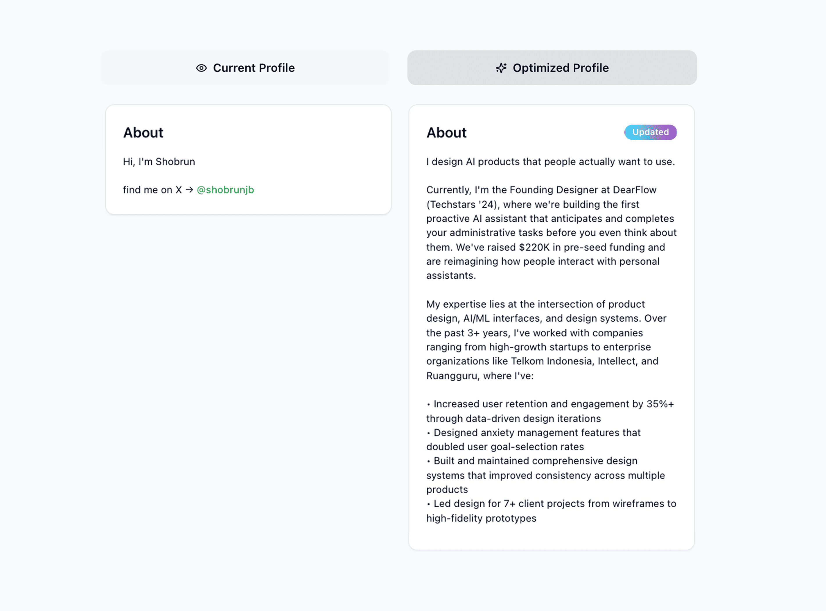 Your “About” section is your first impression. Our AI analyzes your tone and structure to help you write a personal yet professional summary that sounds like you — but optimized for visibility and engagement.