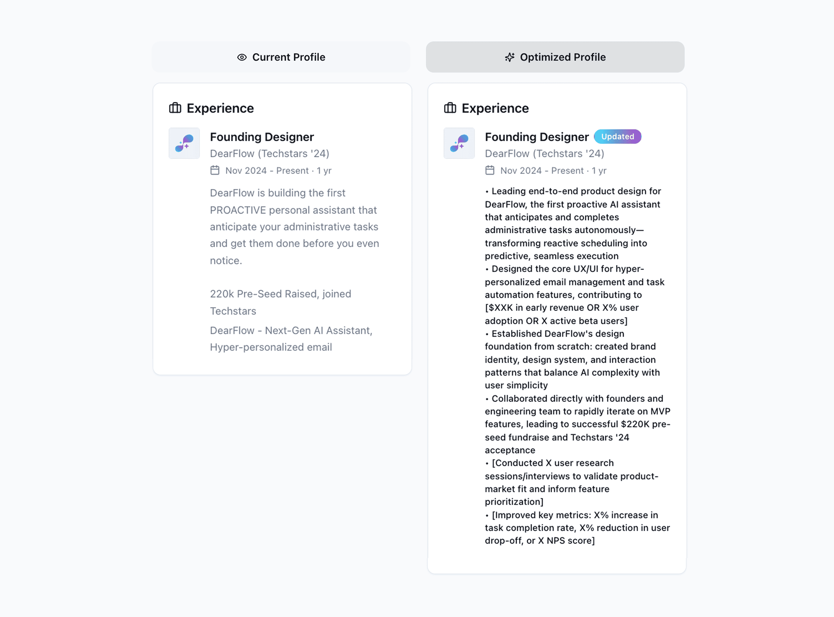 Stop listing tasks — start showing impact. Get AI-generated rewrites that highlight achievements, metrics, and results so your experience section actually sells your skills and expertise.